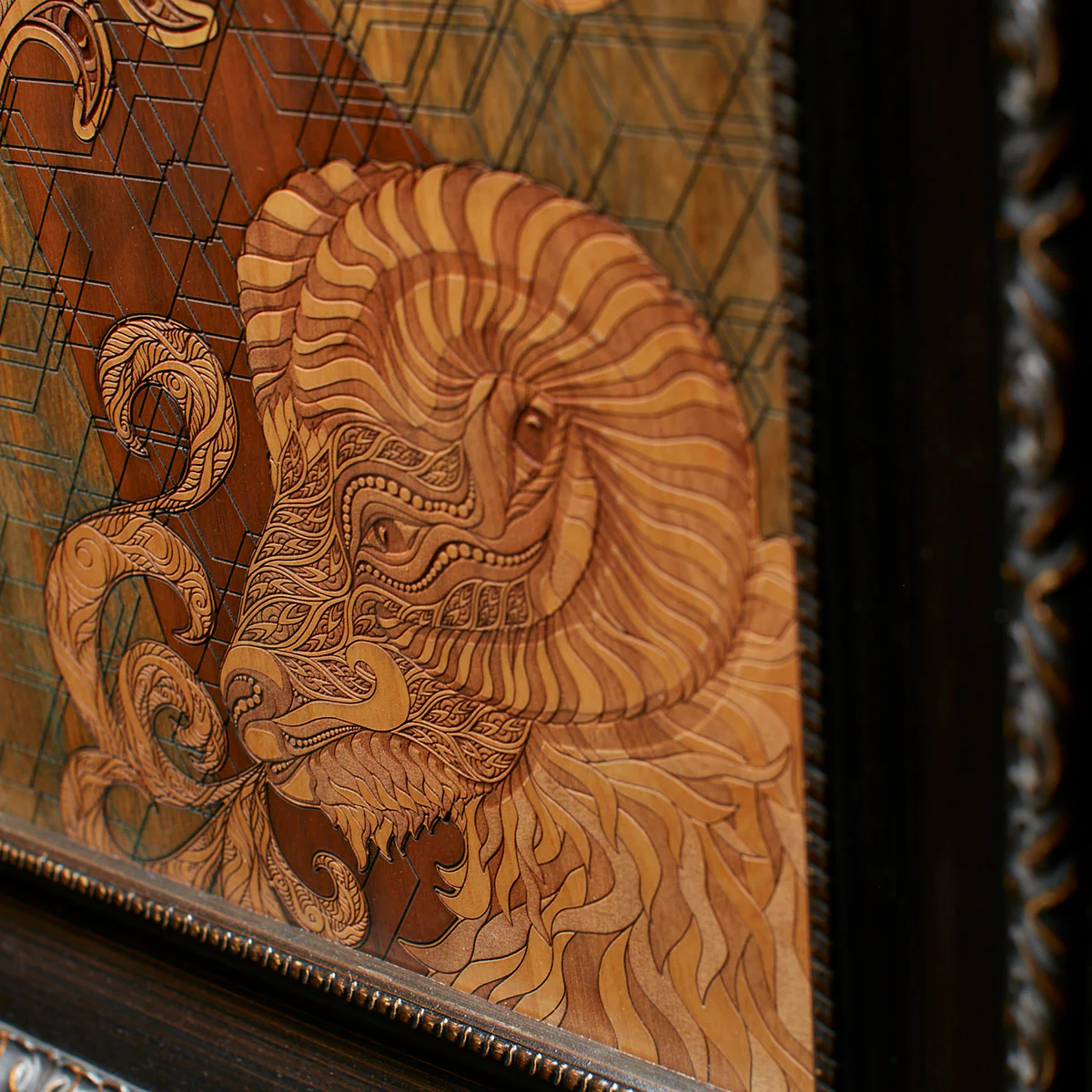 My vision with this piece was to print the entire image on 3 different species of wood, alder, walnut, and blue pine... cut them up into segments... then mix and match, and re-assemble them like a puzzle. This way we end up with three different versions of the same piece and there is zero scrap left over. Essentially turning three panels of wood into three collage pieces. There is also some major inlay work on this one with various colors of 1/8" mirrored acrylic.