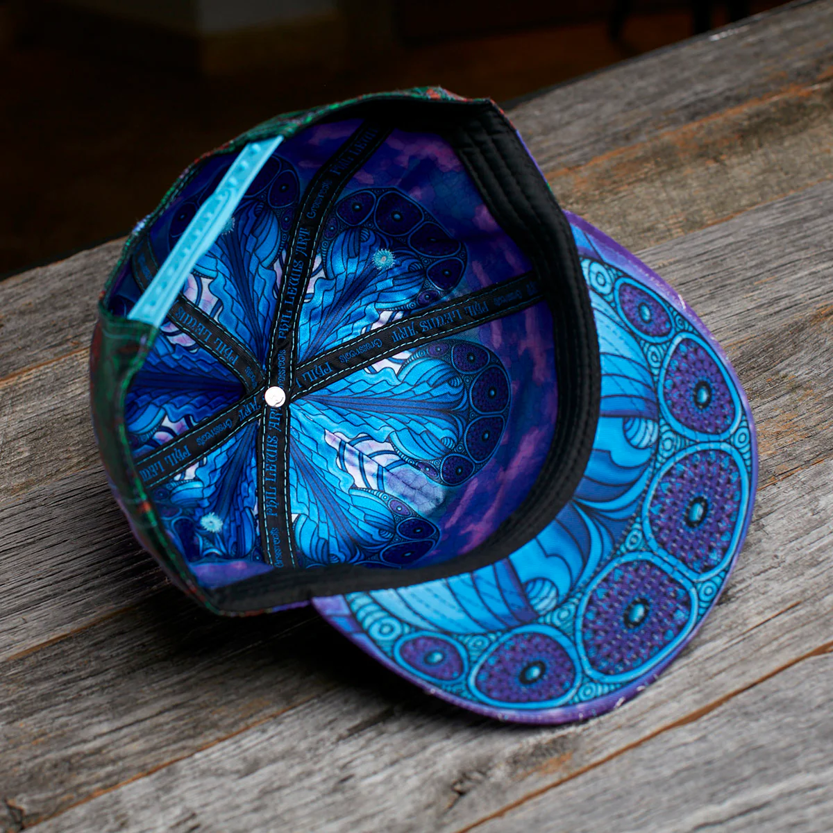 This hat is a shallow fit design with sublimated panels featuring artwork from Jellyfish Nimbus, complimented by a two-colored embroidered design on the brim. The colorful underbrim and interior lining display more Jellyfish craziness :)